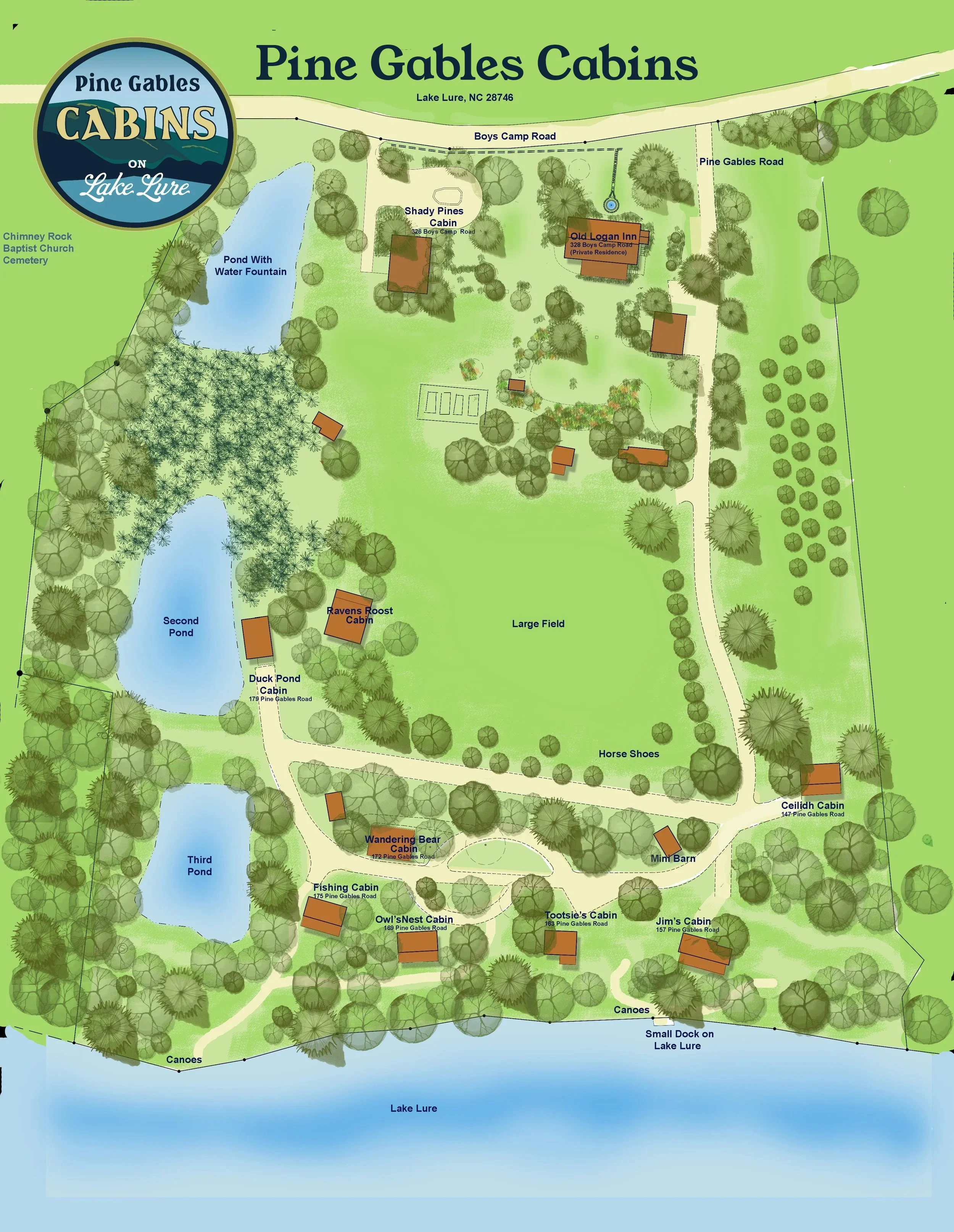 Located on the grounds of the old inn at Pine Gables we have two simple and rustic log cabins built along the banks of Lake Lure, and three wood frame cabins. Our property, Pine Gables Historic District, is listed on the National Historic Registry.